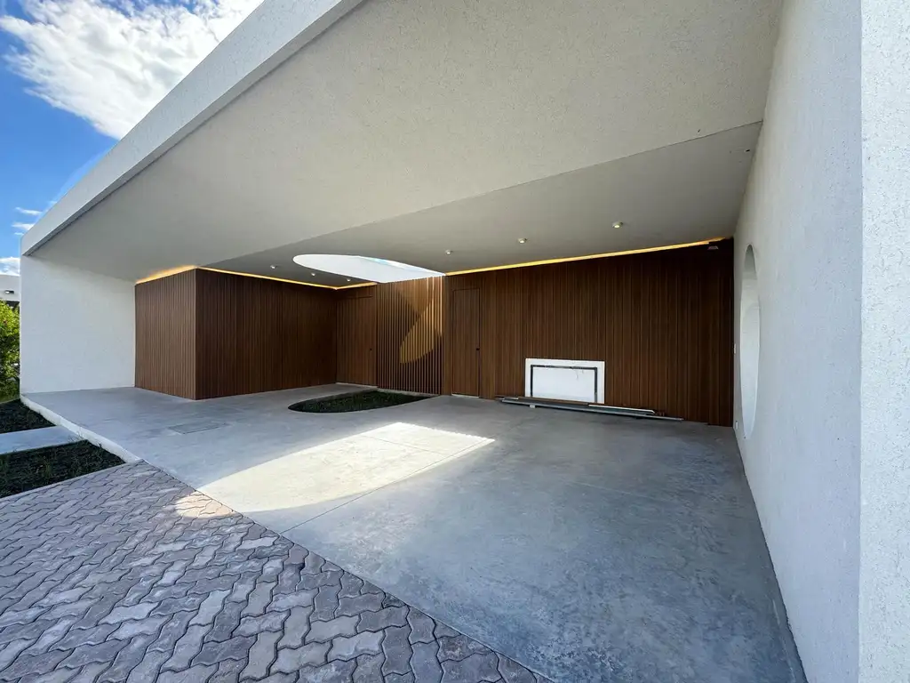 Al ingresar nos recibe un sector semi-cubierto con espacio para dos vehículos y el acceso principal al interior de vivienda, ambos en comunicación con un patio integrador.
