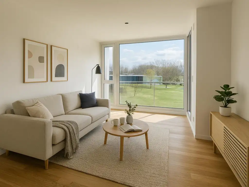 -Pisos de madera clara en living y dormitorio, porcelanato en baños y cocina.