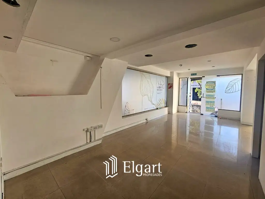 Local de 100 m²: Salón amplio con frente vidriado, pisos de porcelanato, un baño y patio.