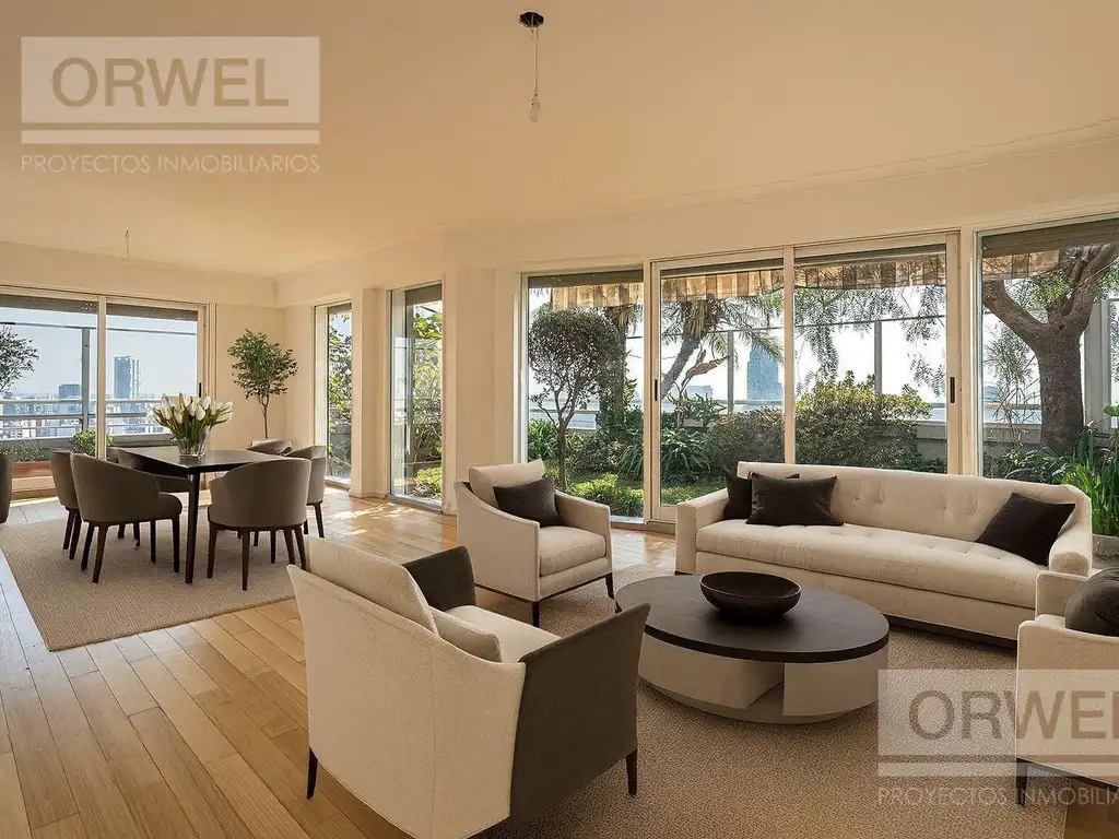 El departamento tiene equipos de aire acondicionado en todos sus ambientes, Calefacción por losa individual por caldera, persianas y toldos eléctricos en living comedor, baño con válvula y pisos de madera. El jardin cuenta con riego por goteo y aspersores. Horno eléctrico y hornallas a gas. Instalación eléctrica para poder reproducir música en todos los ambientes. Por el ascensor del edificio se accede a ambos pisos.