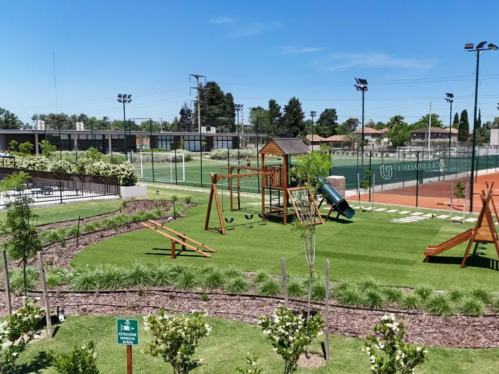 Son 5 hectáreas de espacios verdes, circulación e infraestructura de servicio y deportiva, 3 edificios independientes (Club House, gimnasio y quinchos con Parrillas) Cuenta con Pileta de 25m de largo, pileta para niños, y un amplio solárium, 3 canchas de tenis de polvo de ladrillo, 2 canchas de padel de ultima generación, Una cancha de césped sintético de futbol 7, Plaza con juegos para niños.