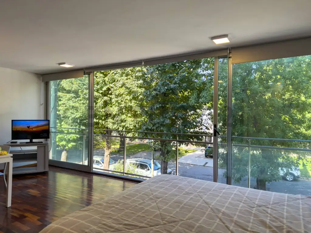 Amplio monoambiente con gran ventanal frente al parque garantizando luz y ventilación natural.
