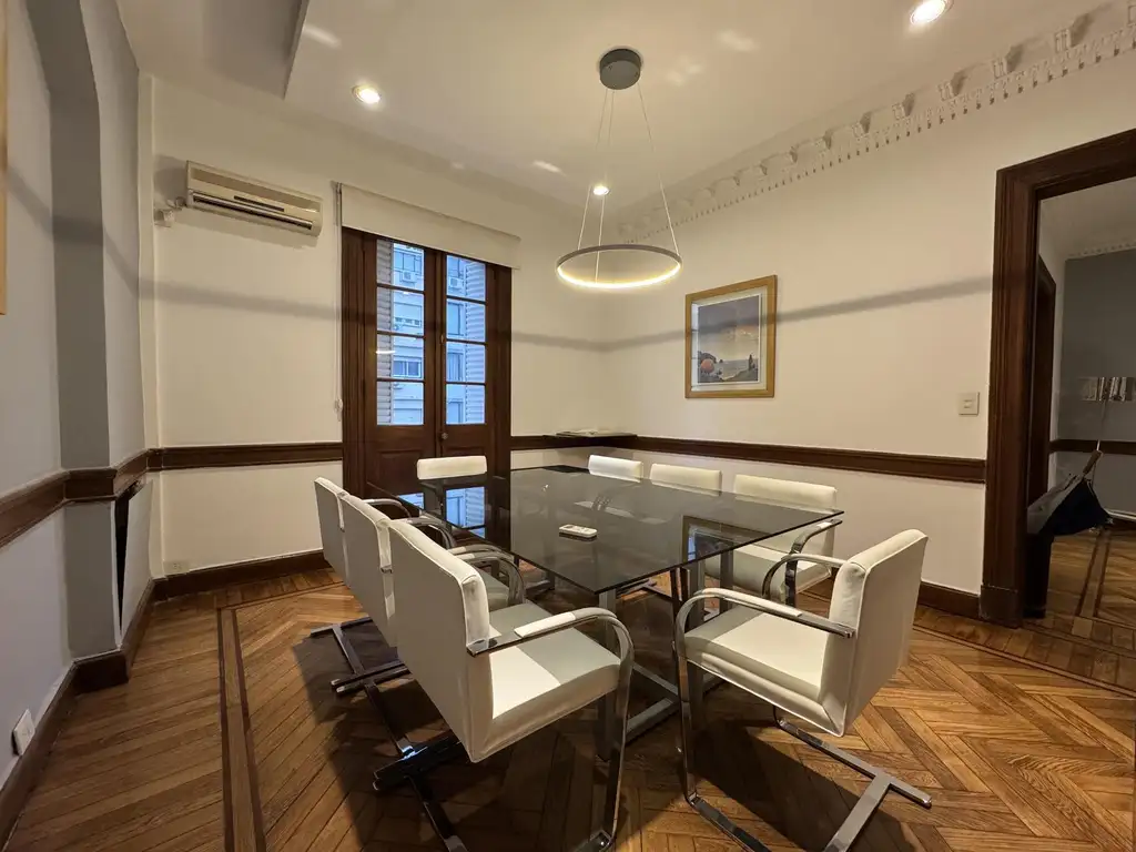 En el 5to piso, cuenta con una elegante recepción con pisos de roble con marquetería. Ofrece siete despachos: dos al frente con balcón, dos al contrafrente con pulmón abierto y tres internos, uno de ellos amplio y luminoso. Incluye tres toilettes y techos altos, manteniendo todo en impecable estado.