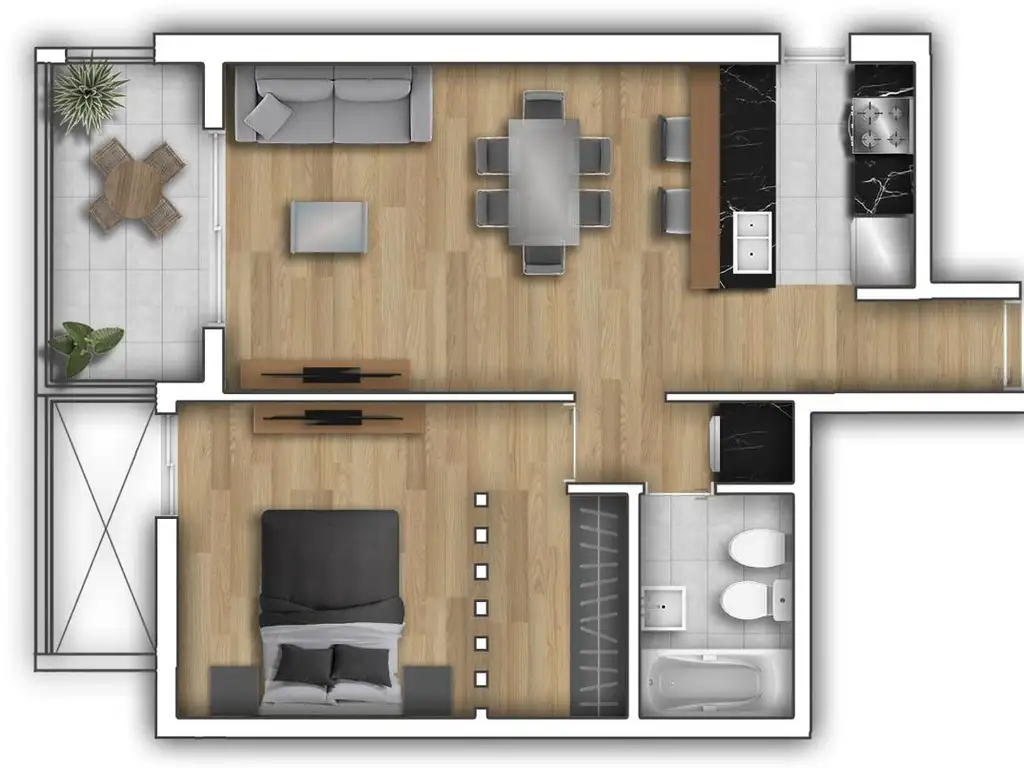 Departamento de un dormitorio con ventilacion cruzada cuenta con cocina comedor, baño y dormitorio, balcon.
