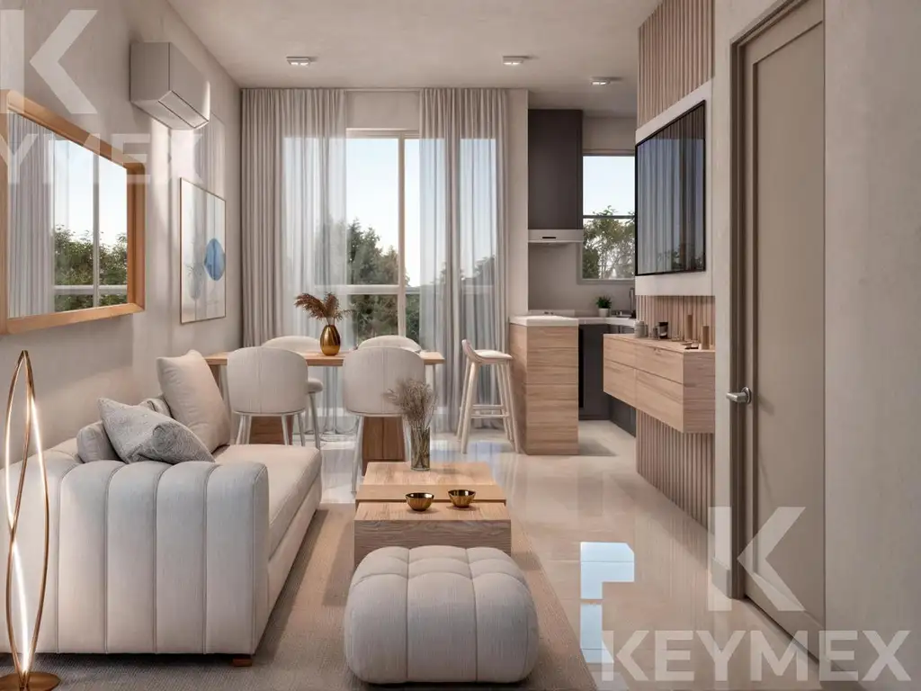 Preinstalación de A/A en estar y dormitorio, y preinstalación para radiadores en todos los ambientes. Aberturas de aluminio MODENA II con vidrio laminado, placard con frente e interiores, cortinas tipo Roller, con tela Black-out en dormitorios y tela sunscreen en living-comedor, cocina con muebles bajo y sobre mesada.