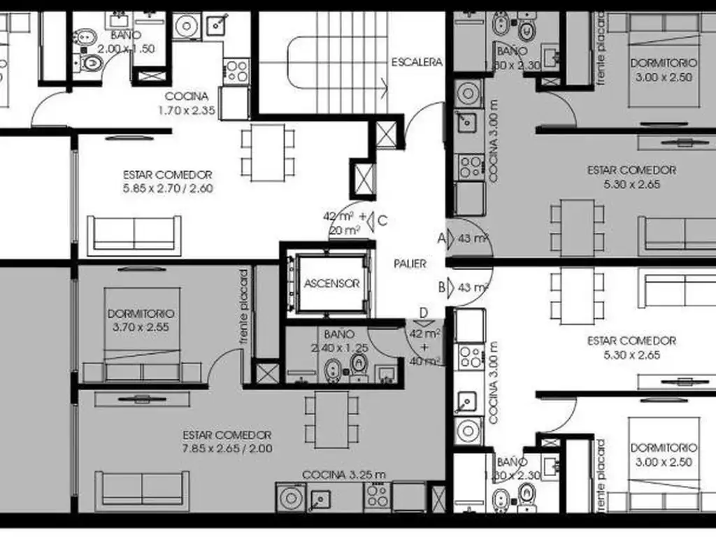 FRENTE DE PLACARES EN DORMITORIOS, BAñOS COMPLETOS CON SANITARIOS LINEA ROCA Y GRIFERIA LINEA FV O SIMILAR.