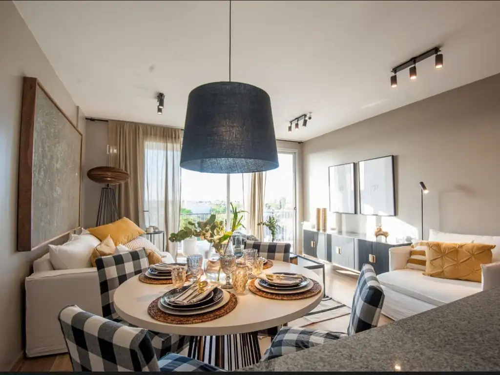 Las terminaciones incluyen pisos de porcelanato símil madera, calefacción por radiadores, cielorrasos de yeso y aberturas de aluminio con doble vidrio. La cocina se entrega equipada con muebles de melamina, mesada de granito y artefactos de acero inoxidable. Cuenta con preinstalación para aire acondicionado tipo split e instalaciones eléctricas y de gas bajo normas vigentes. Cochera opcional.