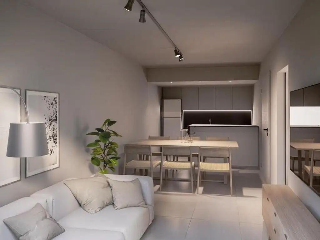 Amplio living con expansion a balcón. Cocina semi integrada completamente equipada.