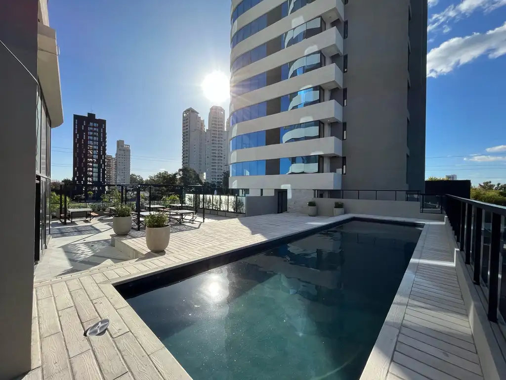 El departamento cuenta con un hall de recepción, cocina integrada, y un living comedor que se abre a un amplio balcón con vista abierta. Dispone de 2 dormitorios, incluyendo una suite principal y un baño completo adicional. Existe la posibilidad de adquirir una cochera cubierta.