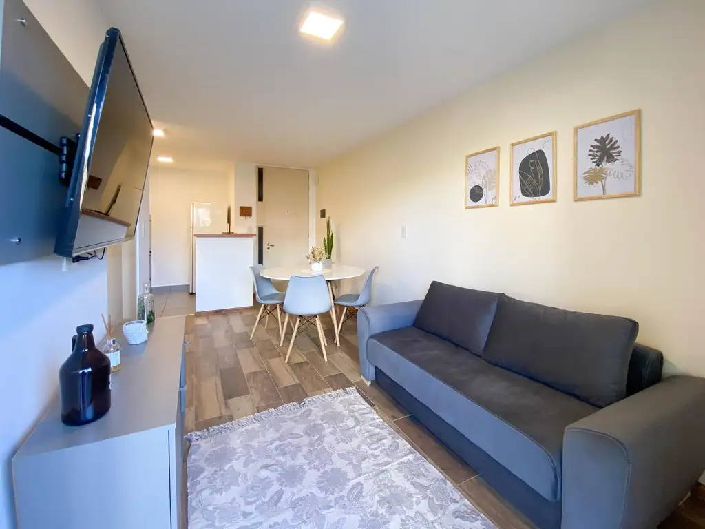 En esta oportunidad la unidad que presentamos es un departamento que al ingresar nos recibe con living comedor, cocina semi integrada por una barra con detalles en madera y salida a un balcón al frente con vista despejada. Por otro lado encontramos ante baño y baño completo con box de ducha. A través de unas mamparas divisorias plegables se genera el dormitorio con amplios placares y salida al balcón.