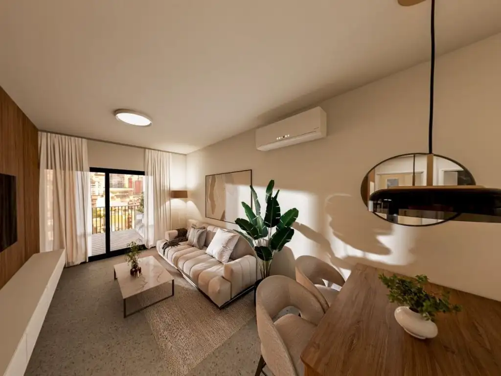 Esta unidad es un departamento de 3 ambientes al frente, compuesto por 2 dormitorios, ambos con placard, toilette de recepción mas un baño completo, cocina con isla integrada al living comedor amplio con salida a balcón aterrazado con conexión de lavarropas.
