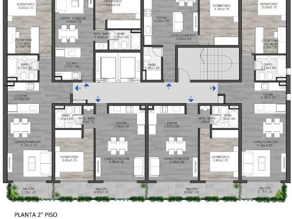 Unidades de vivienda del 2° al 10° piso con tipologías de 1, 2 y 3 dormitorios.