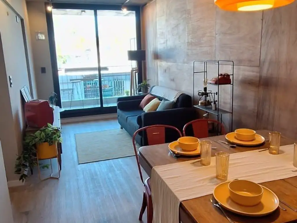 Living-comedor con cocina integrada y espacio para lavarropas.