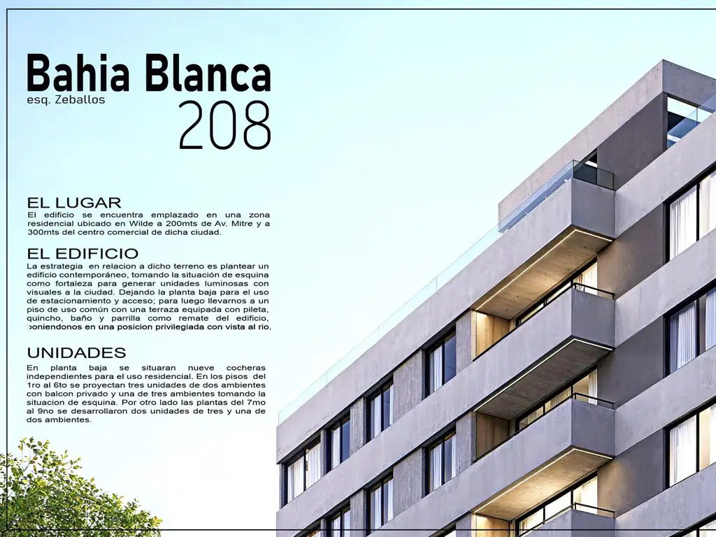 La estrategia en relacion a dicho terreno es plantear un edificio contemporáneo, tomando la situación de esquina como fortaleza para generar unidades luminosas con visuales a la ciudad. Dejando la planta baja para el uso de estacionamiento y acceso; para luego llevarnos a un piso de uso común con una terraza equipada con pileta, quincho, baño y parrilla como remate del edificio, poniendonos en una posicion privilegiada con vista al rio.