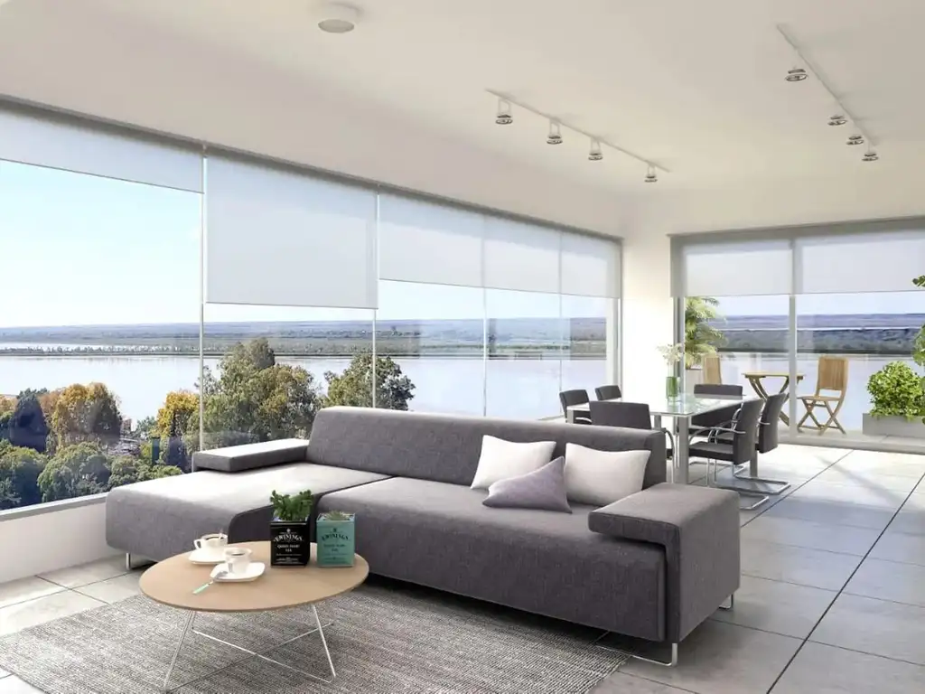 La unidad cuenta con doble ingreso, el principal a living comedor con vista panorámica al río y salida a balcón aterrazado con orientacion este, cocina separada por puertas vidriadas corredizas totalmente equipada con isla desayunadora, amplia mesada de marmol negro Brasil, bajo mesada y alacenas de melamina blanco laqueado, anafe 4 hornallas con parrilla de hierro de fundicion y horno empotrados LONGVIE