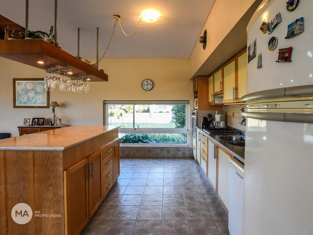 Desarrollada íntegramente en una planta, al ingresar nos recibe un amplísimo espacio de living comedor con cocina integrada. La misma tiene vista al frente y a un generoso jardín con pileta dados los 1.170 m2 que tiene el terreno. Una galería en L recorre todo este ambiente y conforma en parte la cochera cubierta para dos autos.