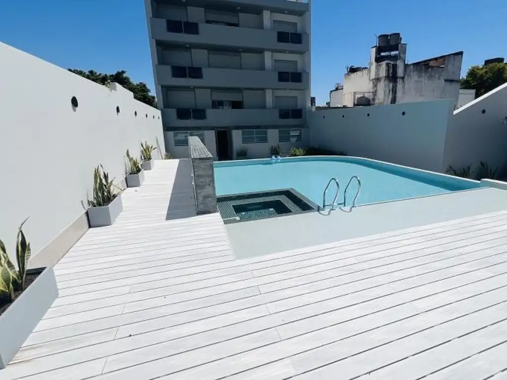 En el mismo piso, de uso común, patio con césped natural piscina con hidromasaje y desborde, solárium, vegetación, SUM, Gym, baños, rampa para discapacitados.