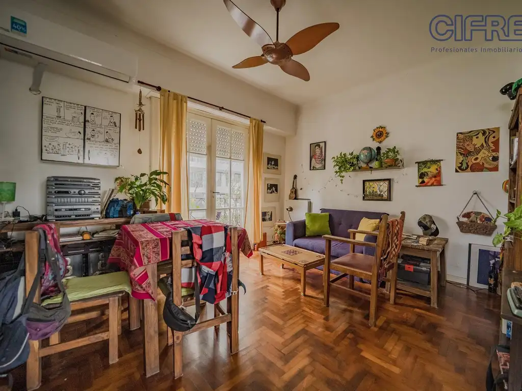 Living comedor con doble ventanal de madera y vidrio con persiana de PVC. Piso parquet. Ventilador de techo.