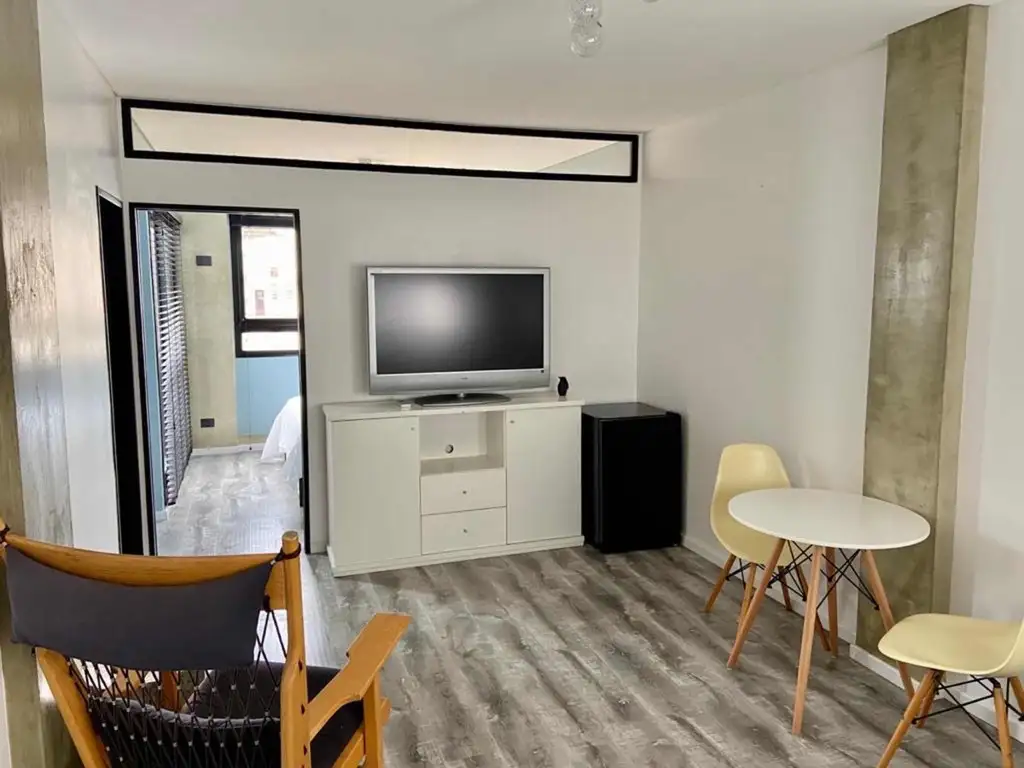 El departamento cuenta con habitación con cama, cocina con aire acondicionado, mesa y dos sillas, mueble de televisión, con Tv, cama doble.