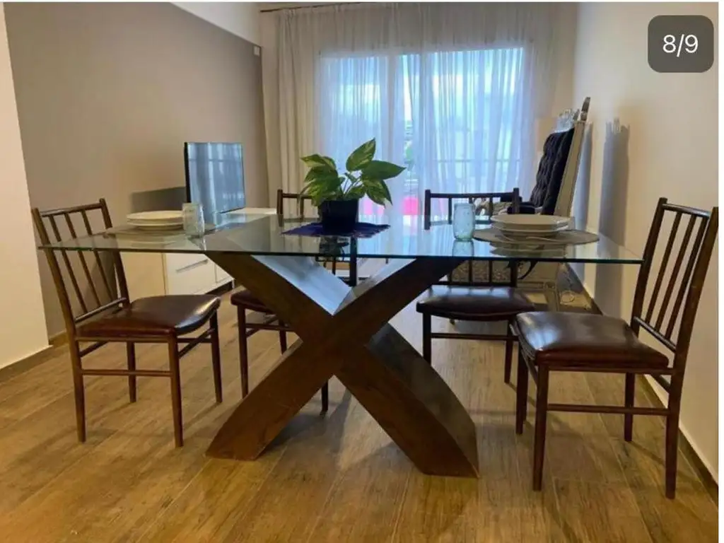 El departamento se compone por tres ambientes , con piso flotante. Al ingresar se encuentra un hermoso ambiente principal , acogedor living con juego de sillones , mesa de vidrio , completamente amoblado, con tv, mesa y sillas para la parte del comedor y gran ventanal que permite entrada de luz natural tanto como una buena ventilación. Posee una moderna cocina integrada, impecable con heladera, microondas , cocina con horno y moblaje completo. Por el pasillo se accede a la habitación que cuenta con cama doble , placard mesas de luz y ventana luminosa, finamente decorado.El baño es completo , impecable con espejo , bañera y videt.