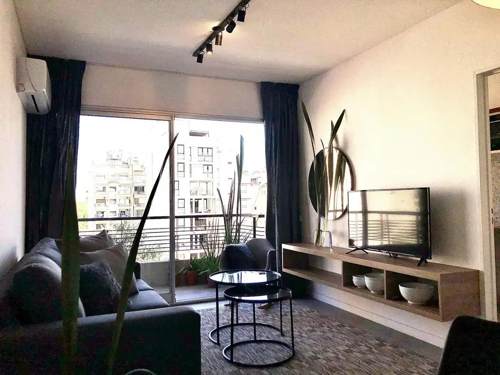 Entrada con amplio placard de recepción. Living comedor equipado con Aire frio/calor BGH, TV Smart de 43", mesa y sillas de diseño para 4 personas, sillón de 3 cuerpos, mecedora, mesas ratonas, mueble tv empotrado en pared, alfombra y cortinado de piso a techo.