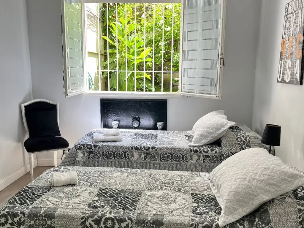 El departamento está ubicado en planta baja y tiene vista al jardín interno del edificio. Es de fácil acceso para personas con movilidad reducida. La cocina está amoblada con alacena y bajo mesada y completamente equipada con heladera con frizzer, anafe a gas, horno eléctrico, microondas, tostadora, pava eléctrica, utensilios de cocina y vajilla. Está amoblada con barra desayunadora con sillas altas, mesa de comedor con sillas. Posee calefactor eléctrico y caloventor. Tiene salida a un pequeño patio propio en el que se encuentra el lavarropas automático y tendedero de ropa. El dormitorio tiene dos camas individuales que pueden unirse, con sus mesas de luz, placard empotrado, Tv Led y aire acondicionado frío/calor. Incluye ropa de cama y toallas.