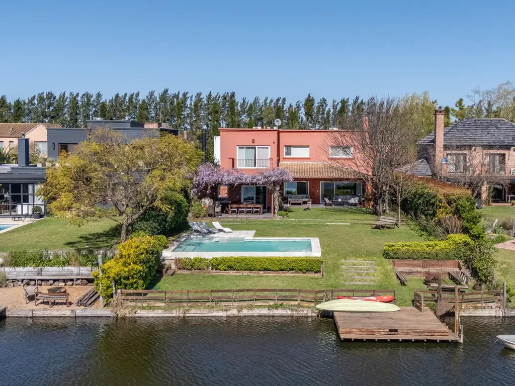 Exterior: dos galerías, una de ellas con parrilla con cerramiento, horno de barro, pileta revestida con borde infinito y solarium, Jardín parquizado con grama bahiana, riego automático, fogonero, deck, muelle y cuarto de herramientas en uno de sus laterales.