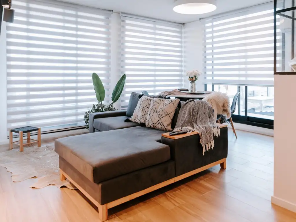 Cocina de diseño semi integrada al living comedor, este cuenta con salida al balcón y a la terraza al frente.