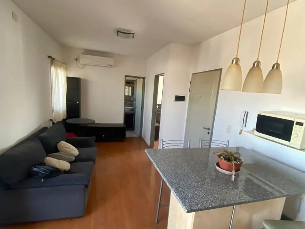 Se ingresa a luminosa cocina comedor - barra desayunadora con ventanales que tienen salida al balcón - cocina eléctrica - termotanque eléctrico (en placard) - mueble de guardado - baño completo con mampara