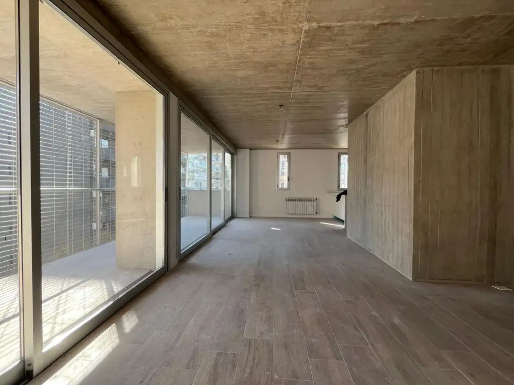 Dos ventanales se abren e integran al balcón corrido que abarca todo el frente de la unidad y hacen, además, que cocina, comedor y living sean muy luminosos.