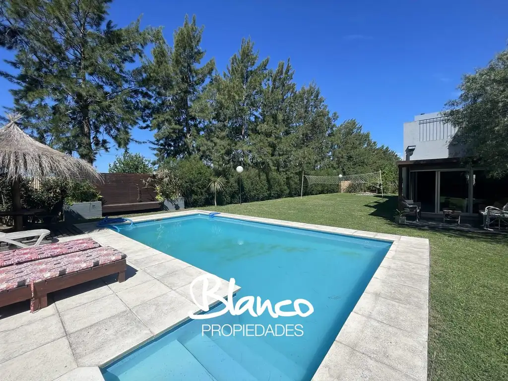 Exterior: Galería cerrada con parrilla, horno y barra. Hermosa piscina de 8 x 4 con solárium y hermoso parque con área de fuego y fogón. Cochera cubierta para 2 autos.