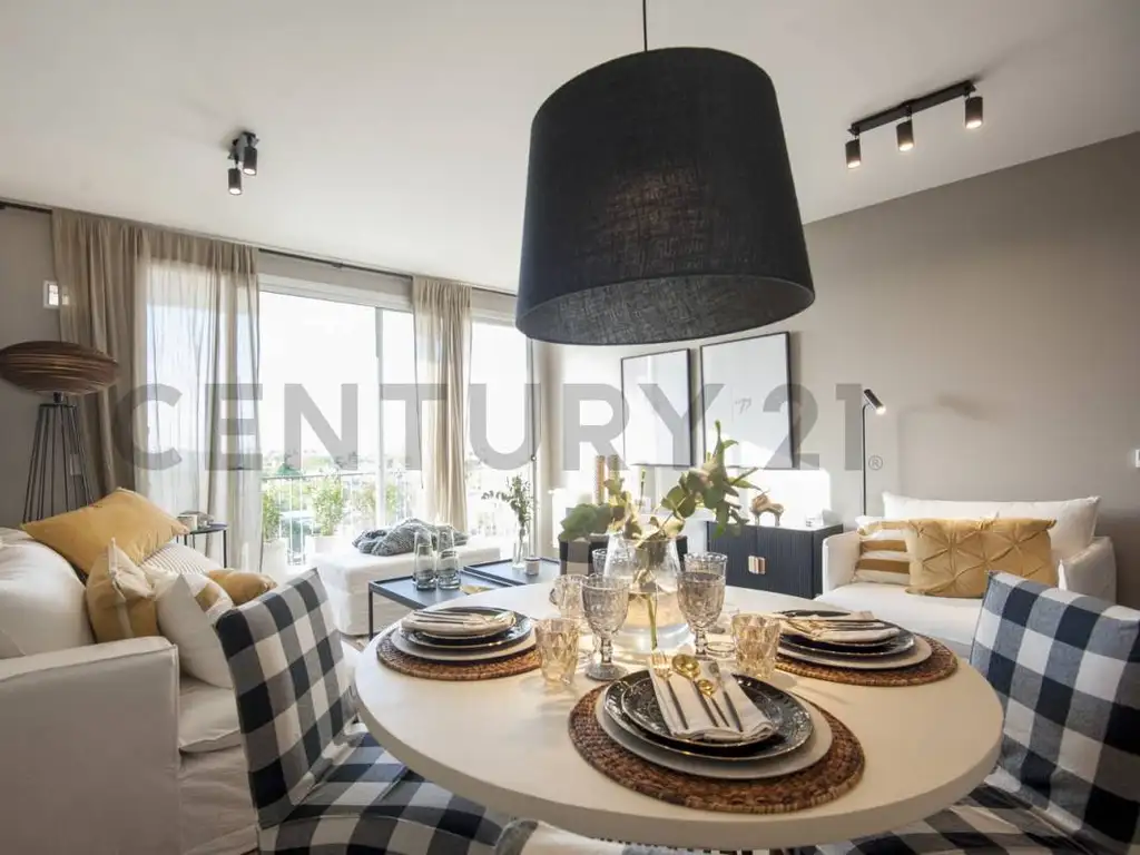 Estar comedor con cocina semi integrada por barra desayunadora; Cocina marca Domec de acero y campana de acero, mesada de granito, muebles bajo y sobre mesada. Pisos de porcelanato simil madera de primera calidad, calefacción por radiadores con caldera dual. Baño completo. Pre instalación de aire acondicionado. Dormitorio con placard completo. Balcón corrido, con acceso desde el estar y el dormitorio.