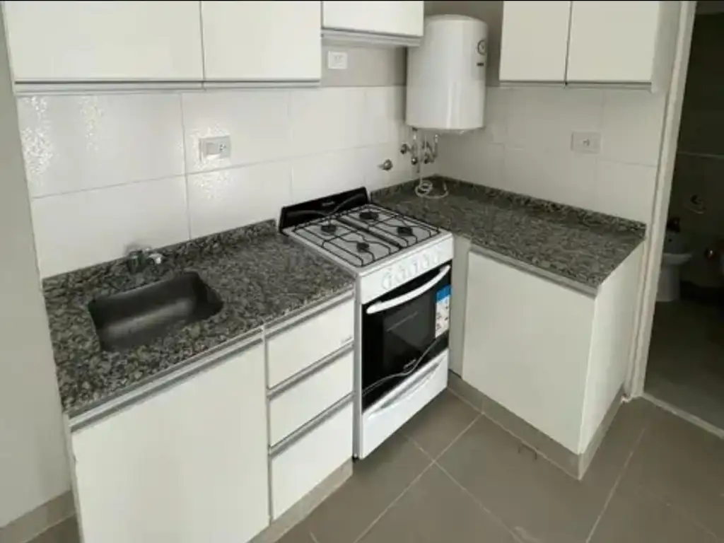 Cocina integrada, con muebles de guardado y espacio para lavarropas.