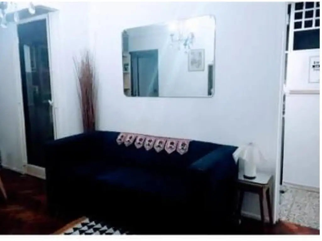 El departamento luminoso en living cuenta con un sofá de tres cuerpos, una mesa con sillas, una puerta a la que se accede a un balcón/lavadero el cual posee lavarropas, la cocina es completa con horno a gas, heladera y cafetera, el dormitorio tiene una cama matrimonial con cortinas blackout y el baño esta completo con toilette, bidet y bañera.