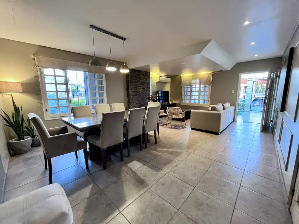 La propiedad se desarrolla íntegramente en planta baja y ofrece una distribución funcional con tres dormitorios, un escritorio ideal para home office, sala de estar, living comedor y comedor diario. La cocina está separada y se complementa con un quincho cerrado con asador, perfecto para reuniones.