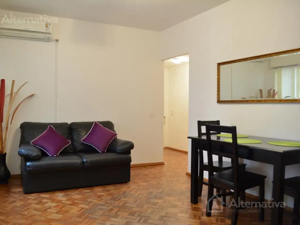 Desde un palier de recepción con perchero y cuadros se ingresa al living-comedor equipado con un moderno rack, TV LED Smart, sofá cama de dos plazas, juego de mesa con cuatro sillas, Aire Acondicionado Split frío-calor y lavarropas. Un pasillo interno distribuye hacia el dormitorio, cocina y baño. El dormitorio es amplio con cama matrimonial y vestidor independiente. El baño completo, reciclado y con bañera. La cocina es independiente y está equipada a nuevo: heladera con frezzer, horno microondas, tostadora y pava eléctrica, horno a gas con tres hornallas, batería de cocina y vajilla completa para cuatro personas. Desde la cocina se accede a un balcón vidriado con lavadero y lavarropas.