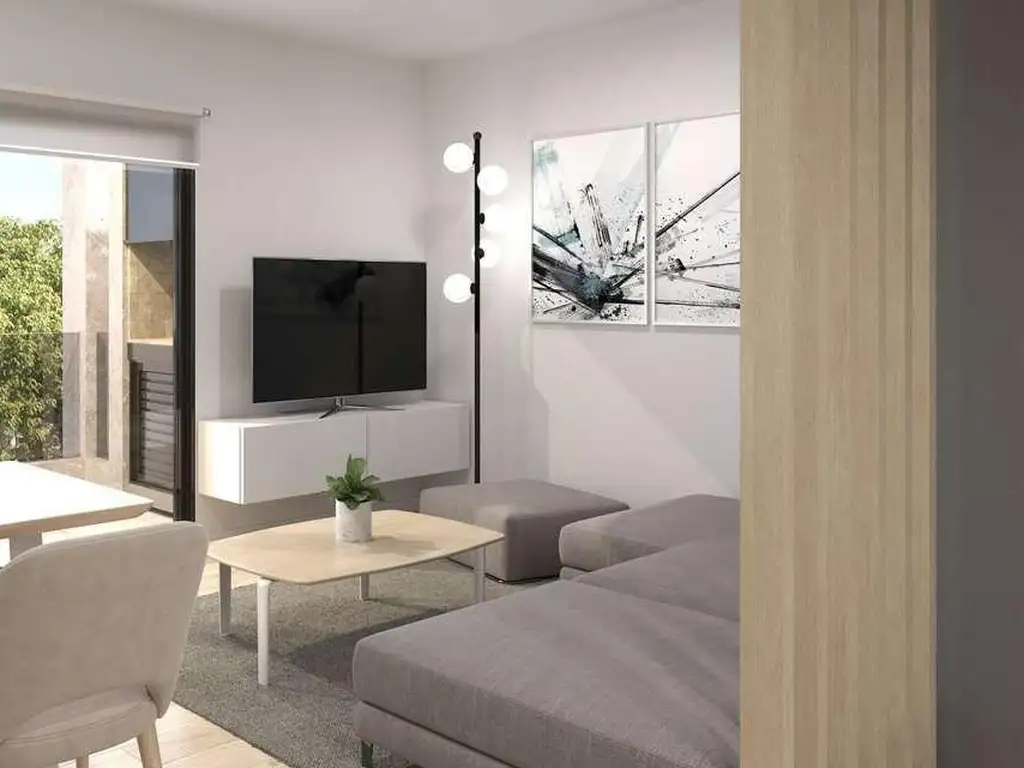 Ingreso al living comedor con cocina integrada mediante barra desayunadora con salida al balcón con parrillero.