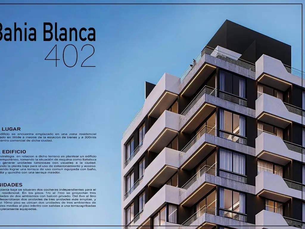 En planta baja se situaran dos cocheras independientes para el uso residencial. En los pisos 1ro al 7mo se proyectan tres unidades de dos ambientes con balcón privado. Del 8vo al 9no se desarrollaron dos unidades de tres unidades más amplias, y en el 10mo piso se ubican dos unidades de tres ambientes de iguales medias al piso inferior con salidas a una terraza privada completamente equipadas.