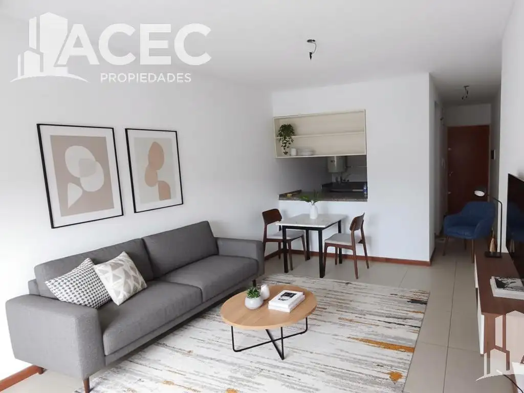 Cocina totalmente equipada con mesada divisoria con espacio de guardado y cajones ,separando al ambiente único. Alacenas y bajo mesada en melamina de color, espacio para lavarropas, doble bacha en acero inoxidable y canilla mono comando, cocina de 4 hornallas a estrenar. Mesada granítica.