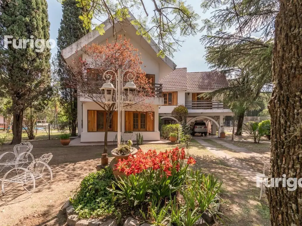 La edificación se encuentra resuelta en 2 plantas:P.B.: Hall de ingreso, living con hogar a leños con vista al parque. Amplio comedor, cocina. Escritorio y baño. Asador cubierto. En la parte exterior dispone de una amplia galería, baño externo, cochera triple. Piscina con bomba y filtro. Cancha de tenis. P.A.: Sala de estar, 5 dormitorios, dos baños, uno de ellos en suit. Balcón.