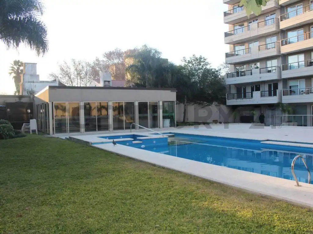 El ingreso al departamento , encontramos amplio living comedor, que posee una hermosa vista abierta hacia el contra frente que da al parque y la piscina desde el balcón terraza,