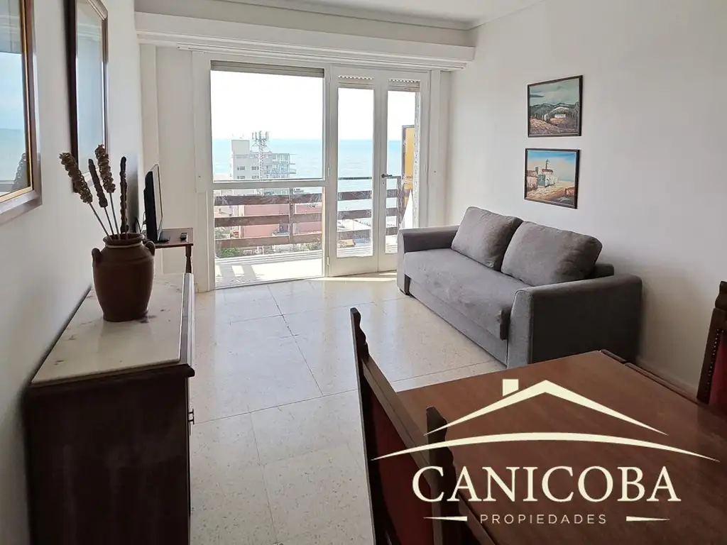 - Living comedor con salida al balcón y vista al mar.