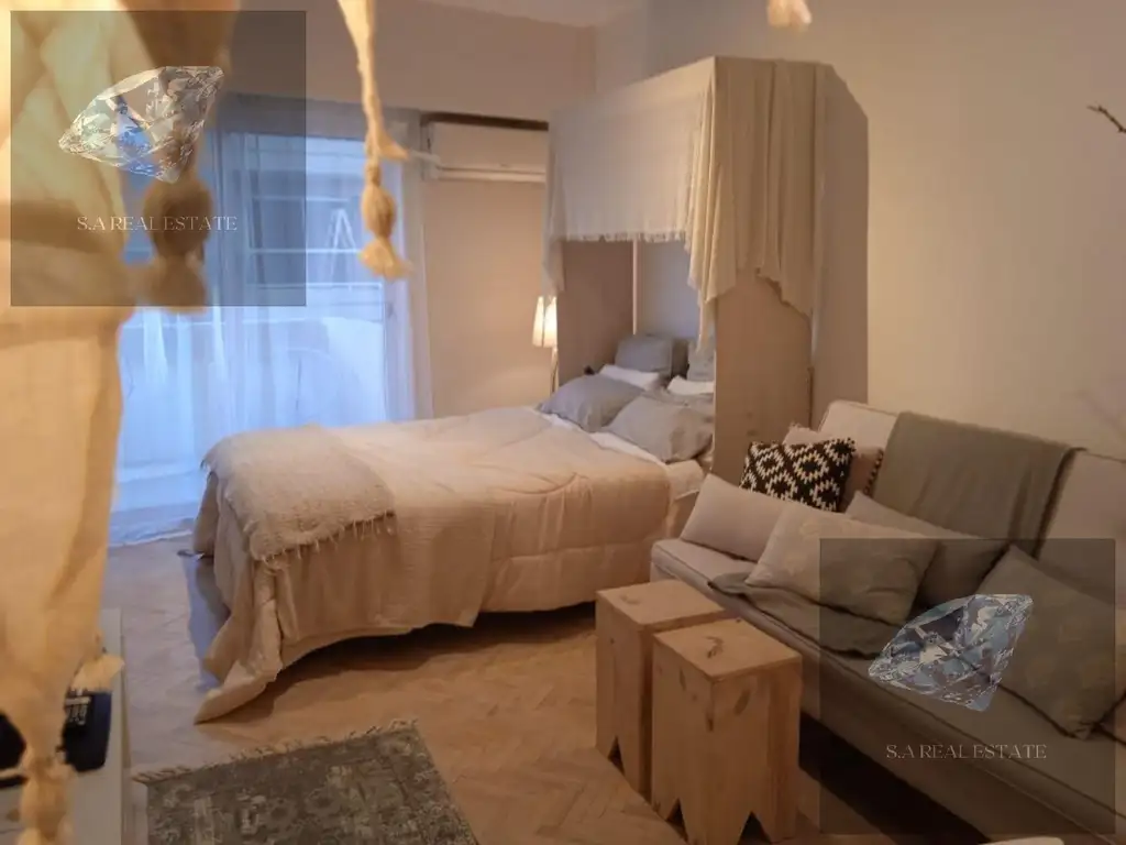 Amoblado: Silla acapulco en el balcón; cama rebatible; sillón cama; dos cajoneras (una además sirve como mueble de TV); mesa y 4 sillas (2 Eams); puerta granero en el baño; puerta original del baño se hizo tapa de mesa (está detrás de la mesa con una alfombra encima que sirve de decoración).