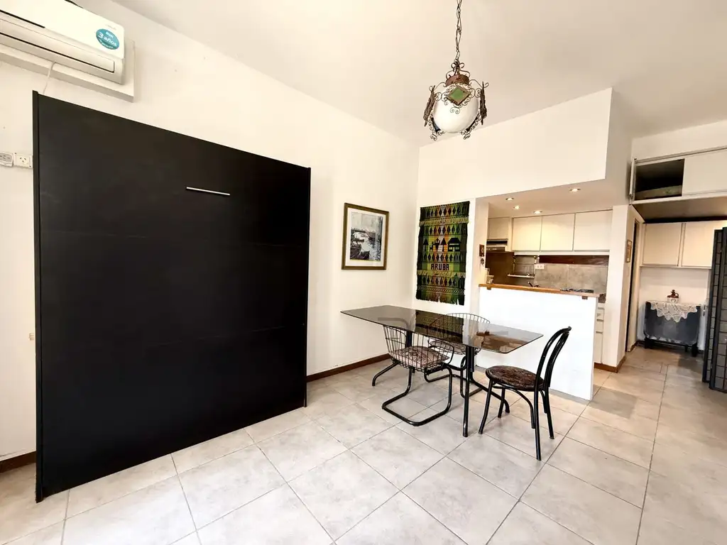 Unidad monoambiente en planta baja luminoso. Este departamento cuenta con cocina semi-integrada, equipada completamente con bajo mesada y alacena, barra desayunadora y placares empotrados. El baño es moderno y funcional, cuenta con revestimientos en cerámicos beige, dispone de un practico box de ducha con mampara de vidrio esmerilado y puertas corredizas.
