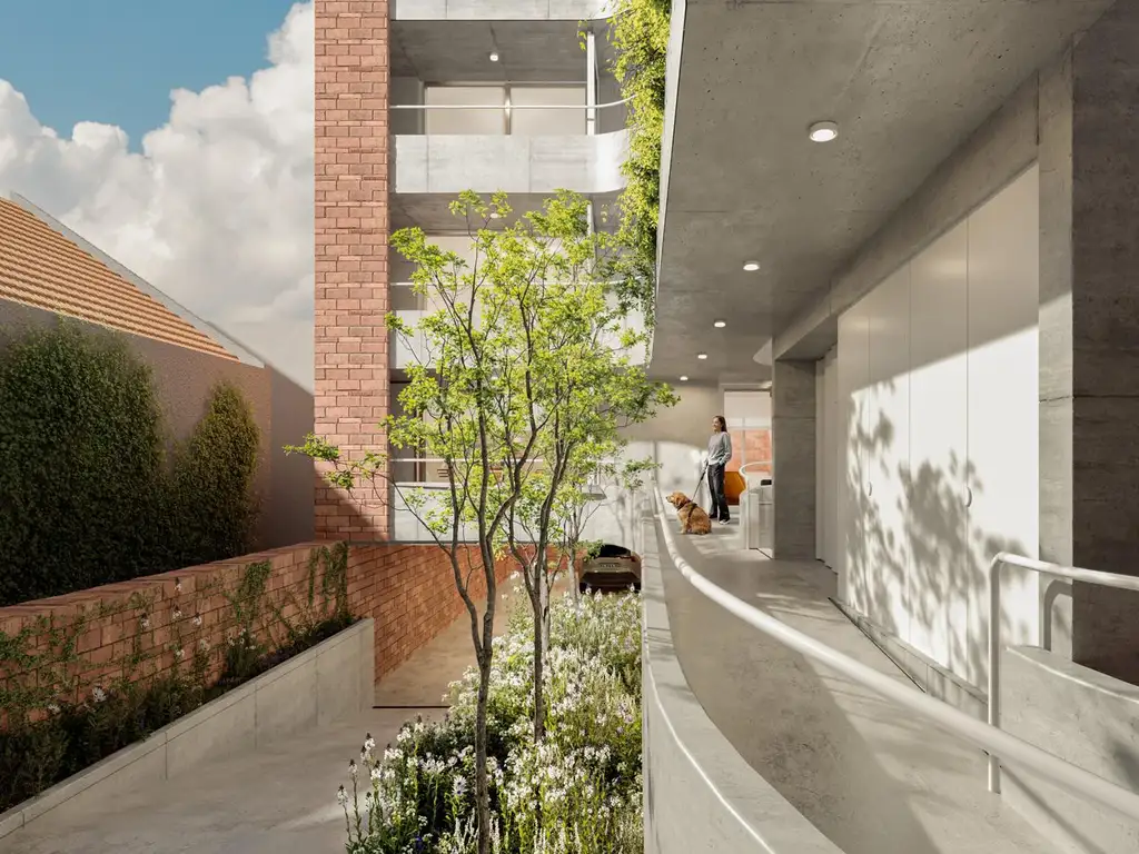 Las áreas de ingreso y circulación en planta baja son amplias, luminosas y poseen vegetación nativa. Los palieres de acceso a los departamentos son diseñados como pasarelas abiertas al patio central y poseen canteros con vegetación. En azotea se ubica el quincho con parrilla y área de terraza de uso común.