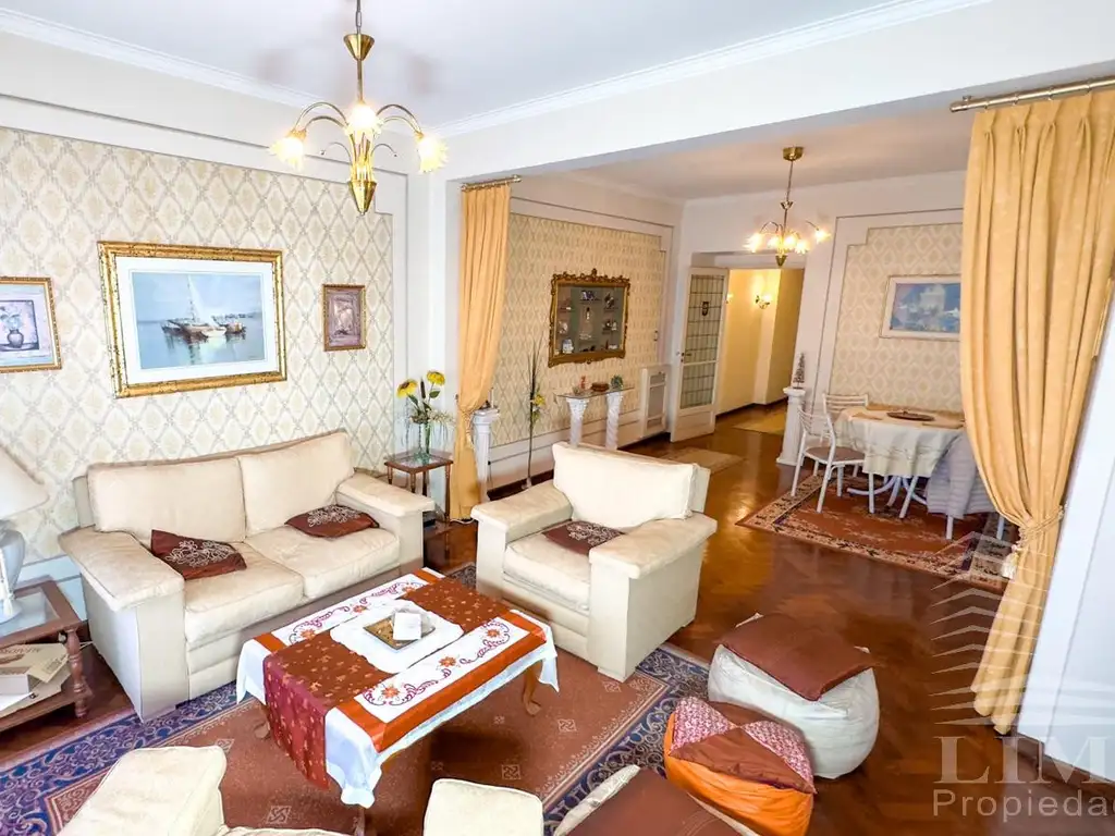 Departamento de piso exclusivo en 4o piso, con doble ingreso (principal y de servicio). La unidad se compone de recepción con placard, amplio living comedor con salida a balcón cerrado al frente, cocina independiente con comedor diario, dependencia de servicio con baño propio, tres dormitorios con placares empotrados y dos baños completos con bañera. Ambientes grandes, luminosos y ventilados, con distribución funcional. Posibilidad de modernización conservando una planta de categoría