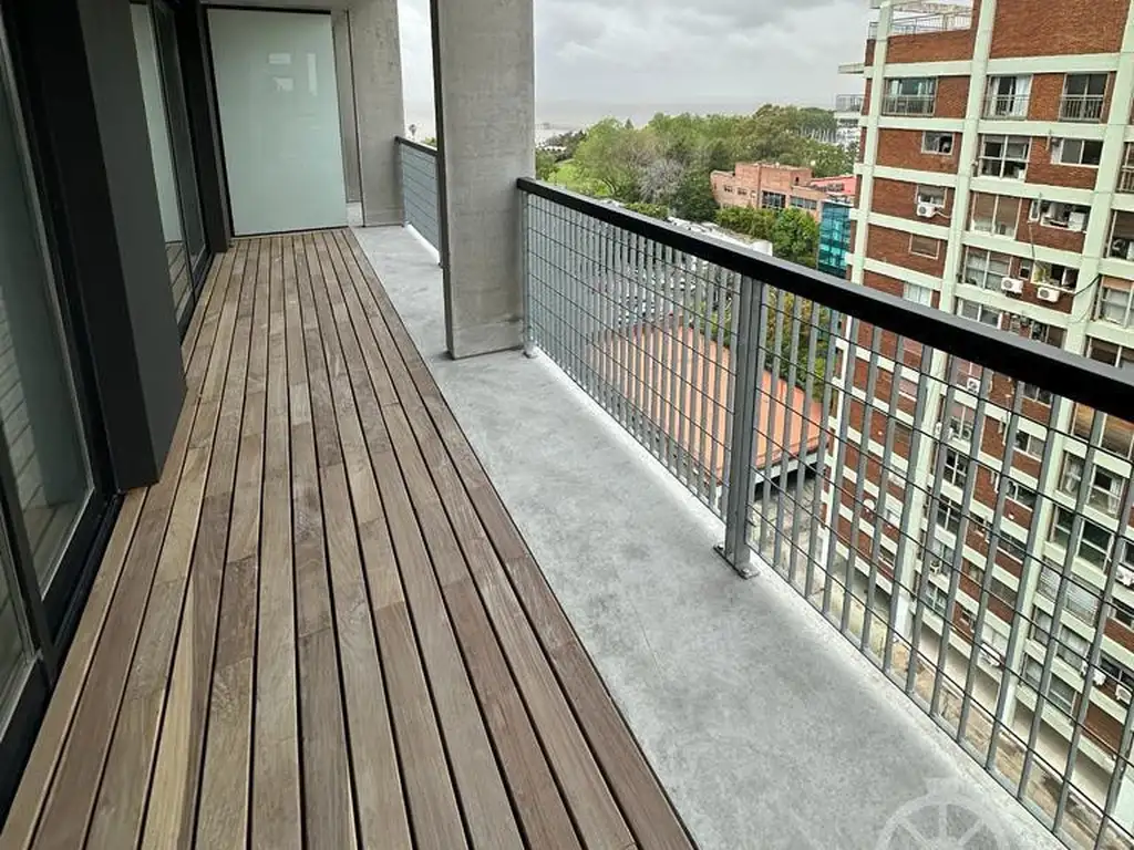 Living comedor con gran ventanal y salida a balcón semicubierto de 13 metros, con deck de madera. Cocina integrada. Toilette. Un dormitorio y un baño completo.