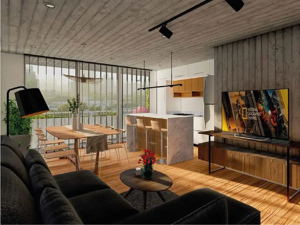Ingreso por amplio living comedor con cocina semi separada por una barra. Salida a un balcón al frente con orientación Norte.
