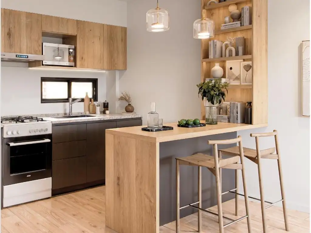 Cuenta con living-comedor, cocina semi-integrada con artefacto de cocina y calefón a gas, muebles bajo mesada y alacenas, 1 baño completo, y dormitorio con placard de piso a techo.
