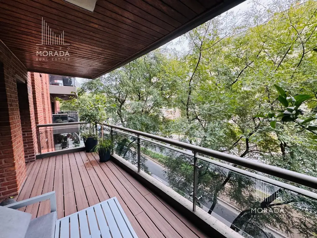 Amplio living-comedor con vista al frente y balcón corrido aterrazado (deck).